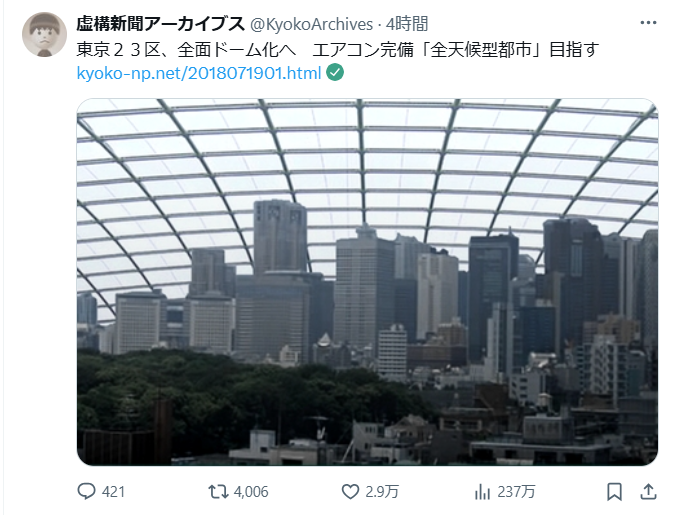 2018年7月19日、虚構新聞は「東京23区、全面ドーム化へ エアコン完備『全天候型都市』目指す」という記事を公開しました。