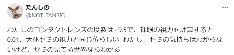 Xのポストで、@NOT_TANSIOさんが「コンタクトレンズの度数-9.5で、裸眼視力は0.01、セミの視力と同じくらい」と話題にし、多くの人が共感しました。