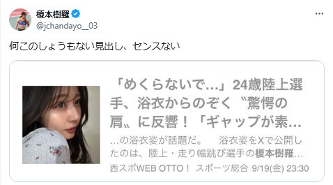 榎本樹羅さんが2025年9月20日にXで投稿した「何このしょうもない見出し、センスない」は、西スポWEB OTTO!の記事への直接的な批判でした。