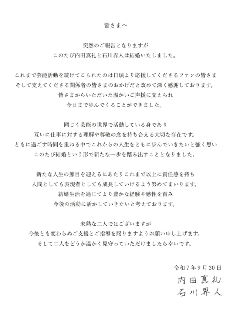 • 内田真礼さんと石川界人さんは、2025年9月30日に結婚を発表されました。