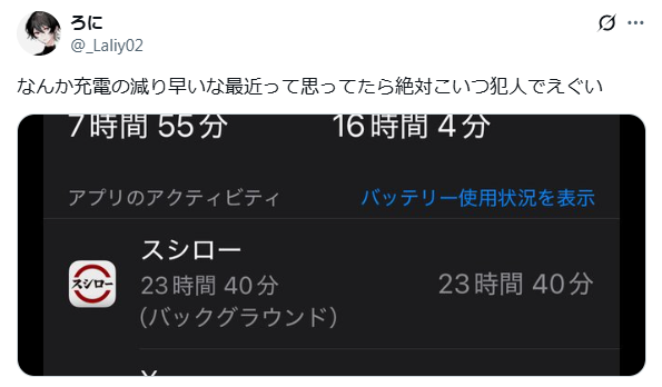 X(旧Twitter)では、蘭区沼夫さんが「スシローアプリ入れたら一生寿司食わそうと常に位置情報使い出してバッテリー爆速で減る」と投稿しています。また、rurunaさんが「スシローアプリ入れたら翌日の夕方にはスマホ充電が20%以下に。位置情報が原因だとは思う」と述べ、アプリ削除で改善したと報告しています。これらの声から、位置情報の常時取得が大きな原因であることがわかります。